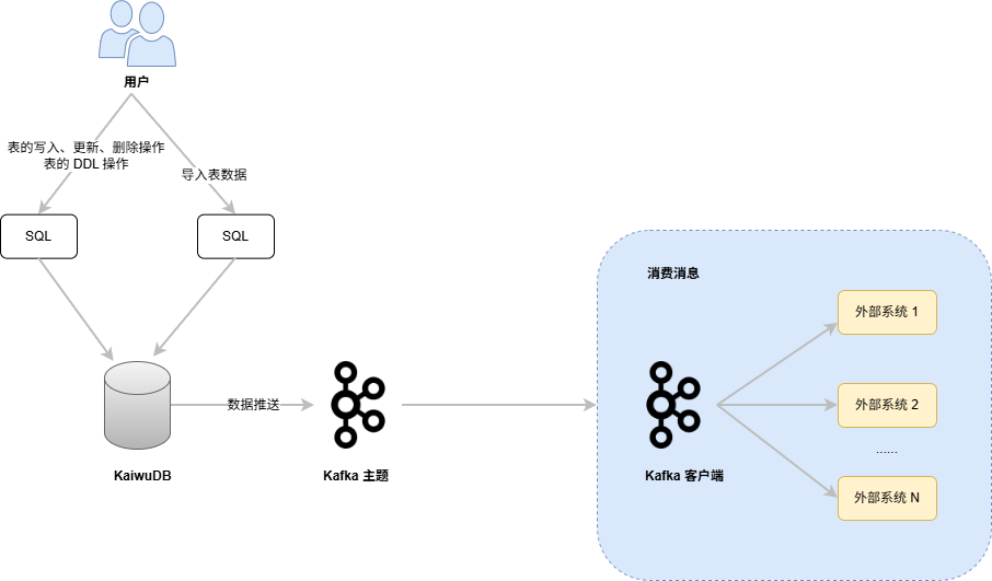 KaiwuDB 支持使用 SQL 语句创建数据推送任务,将时序数据和时序表的 DDL 操作实时同步到 Kafka 主题中。用户使用 Kafka 客户端读取 Kafka 主题中的数据,然后写入到 Kafka 第三方消息组件或者目标数据库。