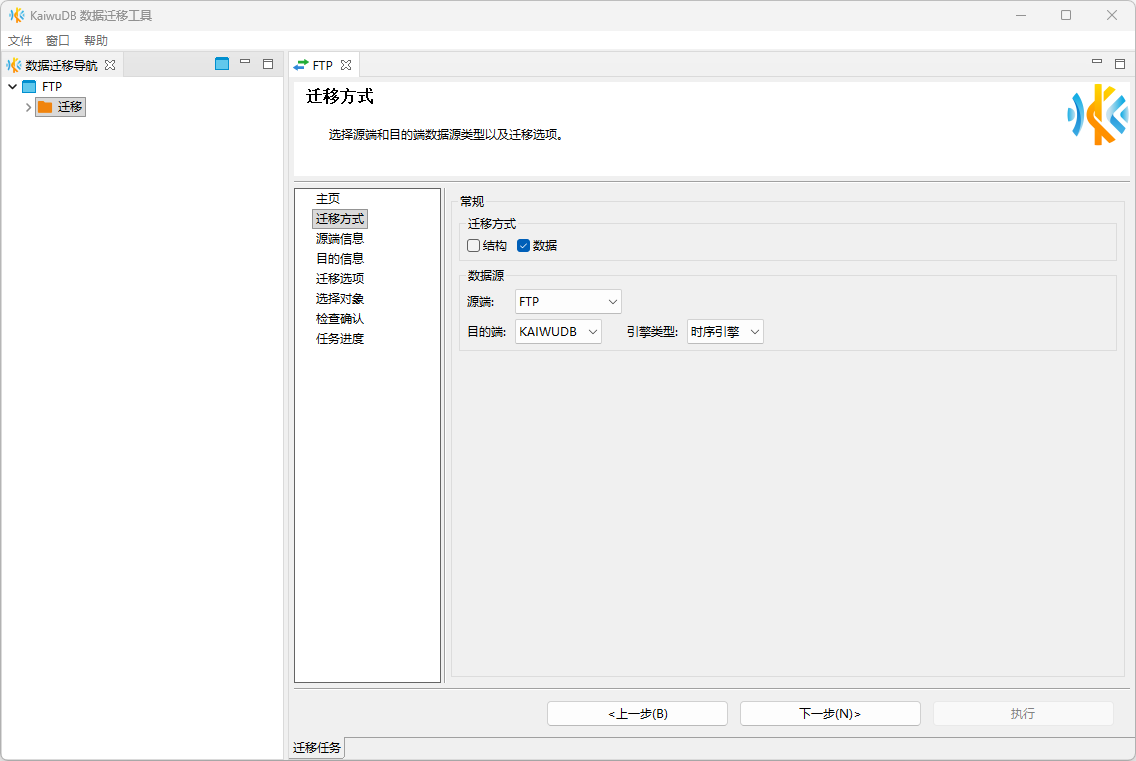 在迁移方式页面,选择数据迁移方式,设置数据源为 FTP,选择迁移到时序引擎或关系引擎,然后单击下一步。