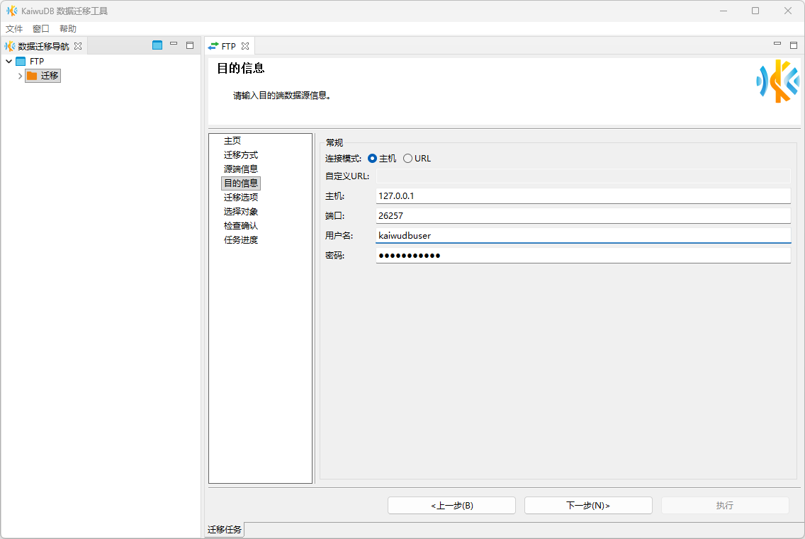 在目的信息页,选择主机或 URL 连接模式,配置 KaiwuDB 数据库的连接参数信息。系统会自动校验连接信息,校验成功后方可进行下一步。