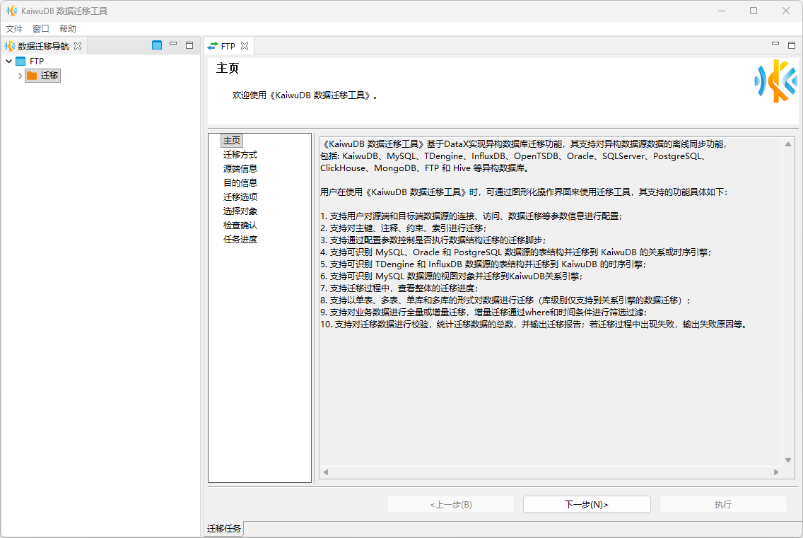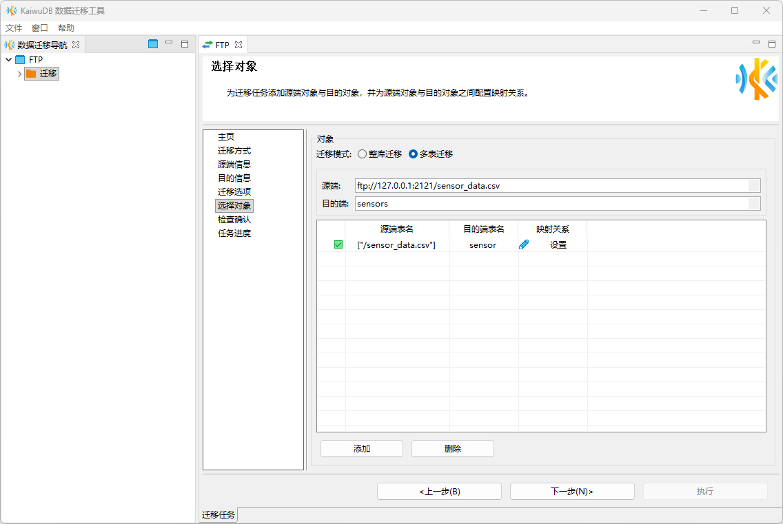以下步骤以 FTP 到 KaiwuDB 的数据迁移为例,说明如何进行非结构化数据迁移: