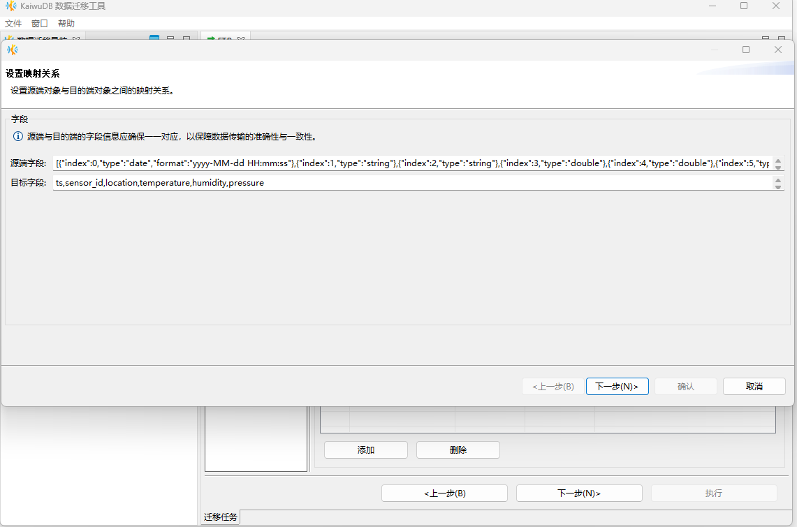 在设置映射关系页面,配置源端文件字段和目的端表字段的映射关系,然后单击下一步。