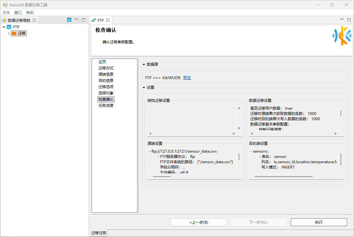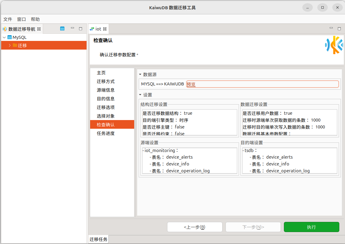 在检查确认页面,检查参数配置信息。确认配置无误后,单击执行按钮开始执行迁移。