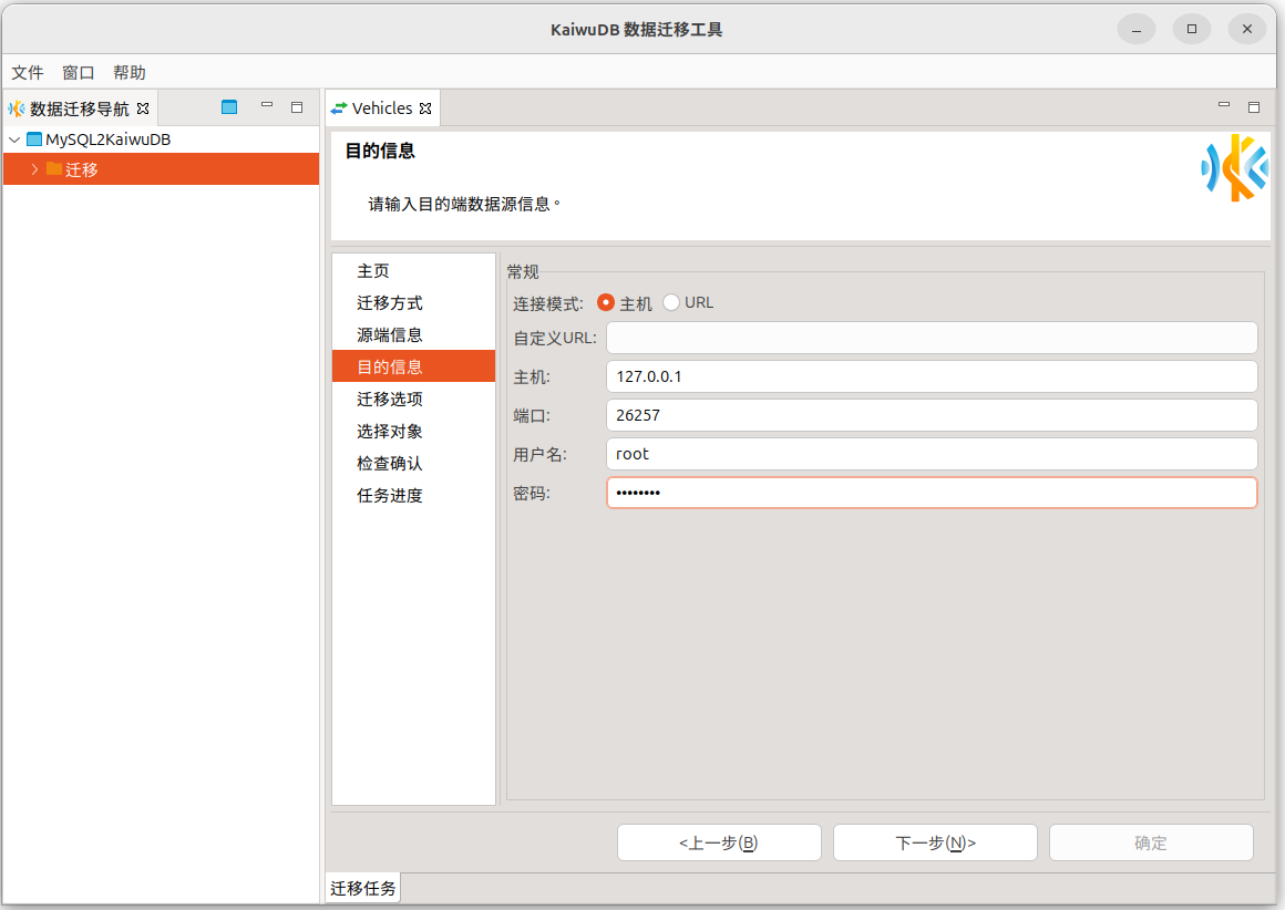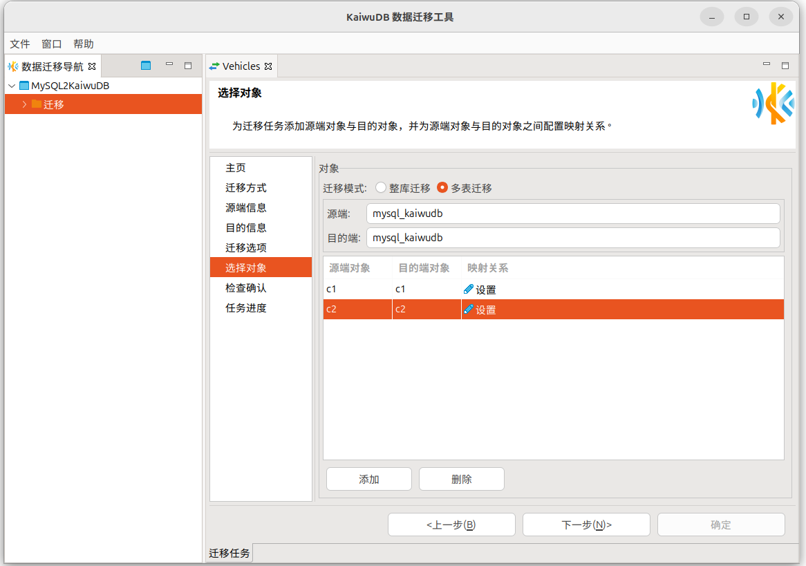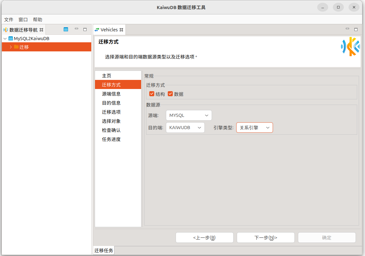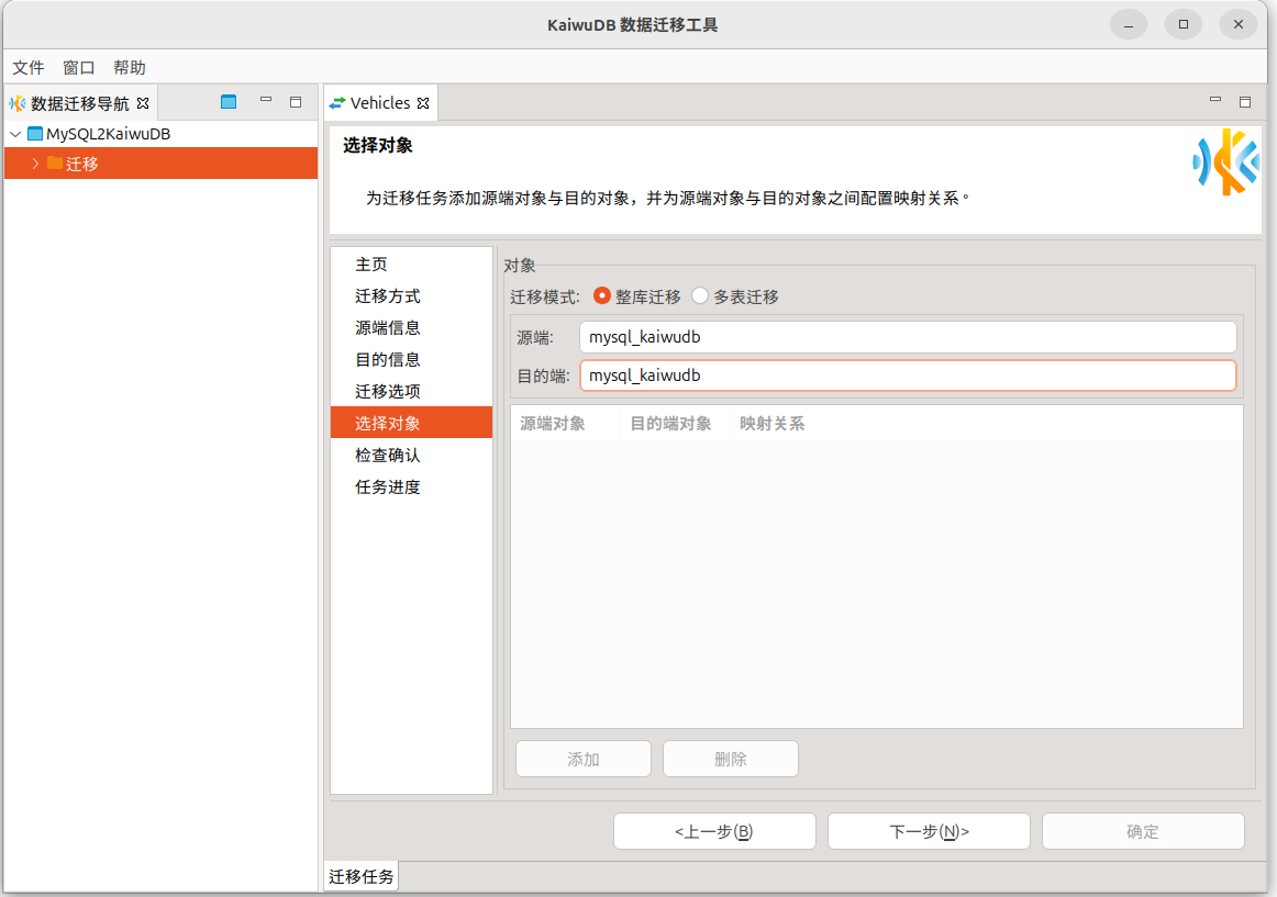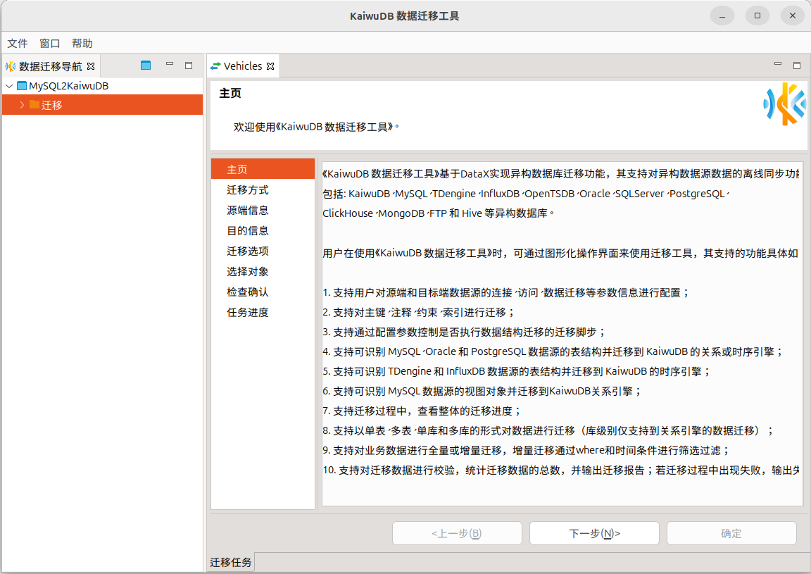 角色的成员,则无需提前建库,KaiwuDB 将自动创建与源数据库同名的数据库。 - 整库迁移仅支持 MySQL、Oracle、PostgreSQL 到 KaiwuDB 关系引擎的迁移。
