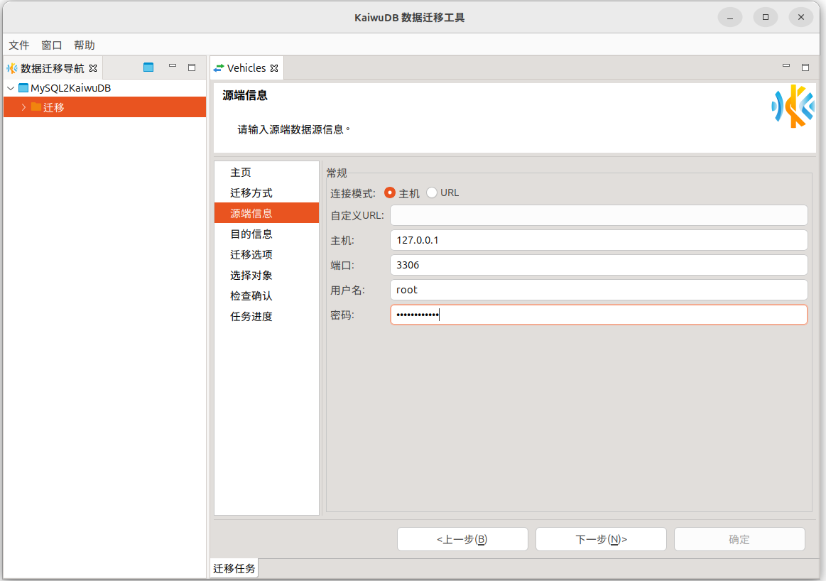 在源端信息页,选择主机或 URL 连接模式,配置相应的连接参数信息。系统会自动校验连接信息,校验成功后方可进行下一步。