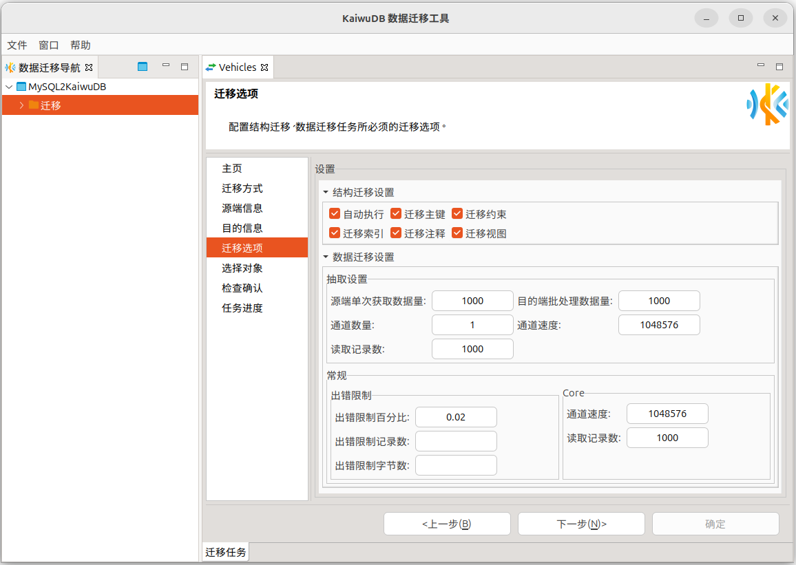 在迁移选项页,根据需要设置结构迁移和数据迁移的参数信息。