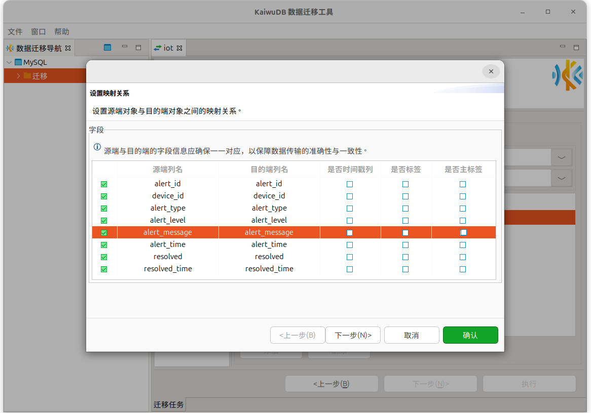 在设置映射关系页面,根据需要选择待迁移的列。如果需要迁移到时序引擎,设置目标表的时间戳列、标签列和主标签,然后单击下一步。