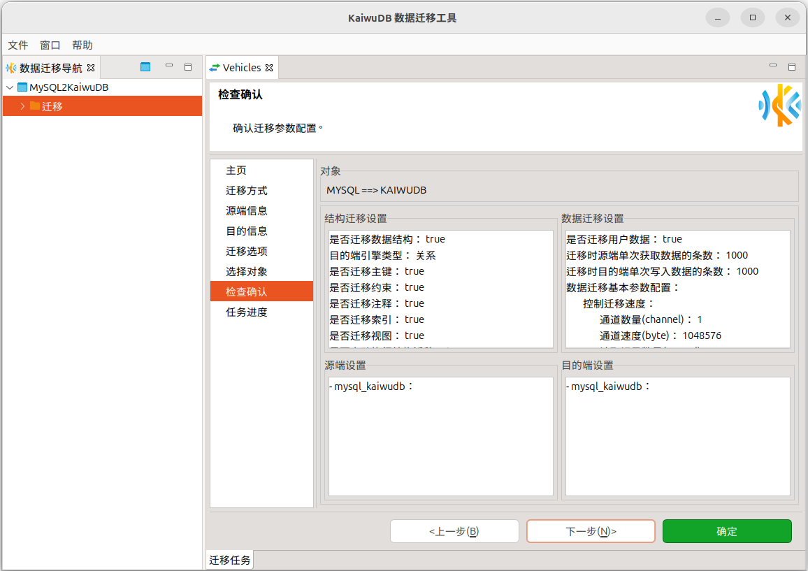 在检查确认页面,检查参数配置信息。配置无误后,点击确定按钮开始执行迁移。