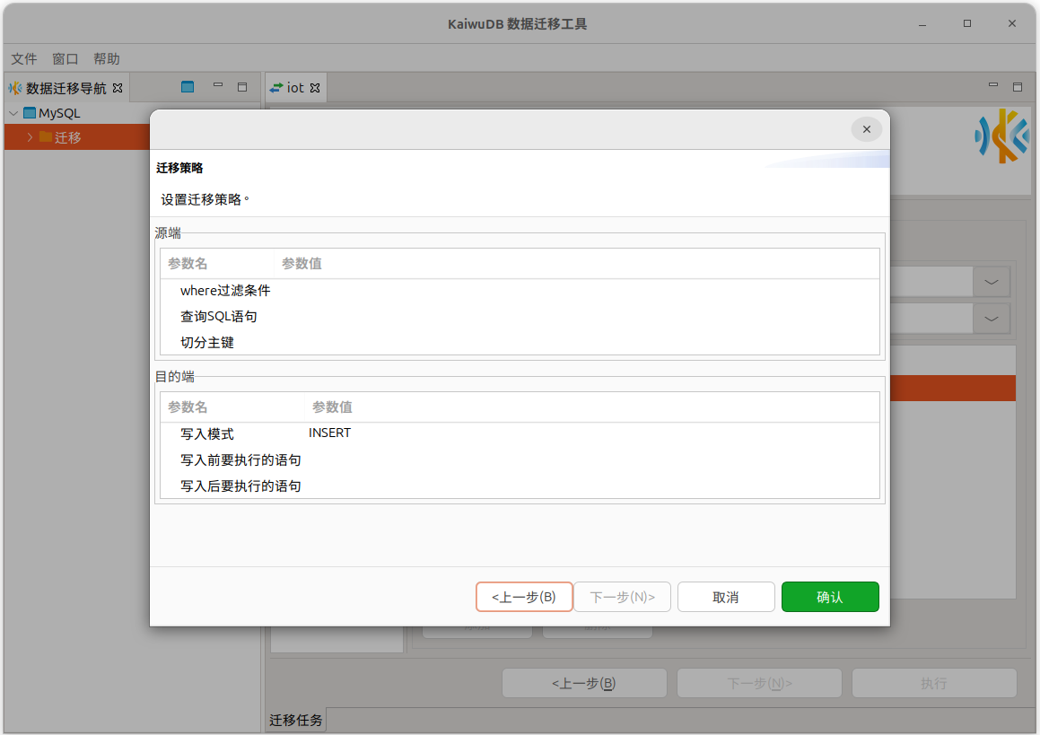 在迁移策略页面,根据需要设置过滤条件、查询 SQL 语句、切分主键、写入模式、写入前后要执行的 SQL 语句,然后单击确认。