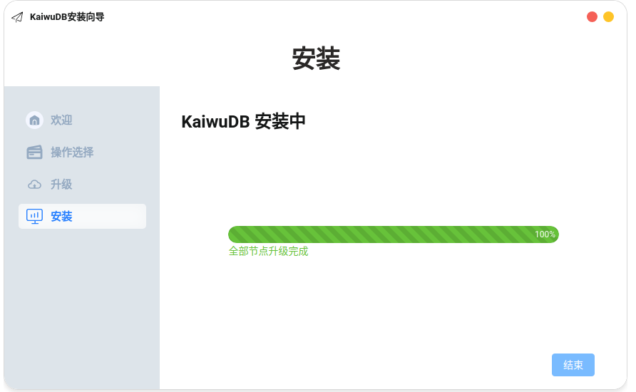 在升级页面点击下一步,系统将自动跳转至安装页面,等待系统提示全部节点升级完成后,即可点击结束完成升级。