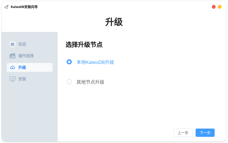 可视化向导升级适用于通过部署脚本和可视化向导安装的 KaiwuDB 单机和集群版本。 升级过程中,如果出现节点未安装 KaiwuDB、KaiwuDB 仍在运行中、版本有误等错误,可视化向导将中止升级,并给予用户相应提示。 升级过程中,如果因新版本导入失败导致升级失败,系统将保留数据目录、证书和配置文件,删除节点中的新版本安装文件,用户可以选择手动安装新版本或旧版本。