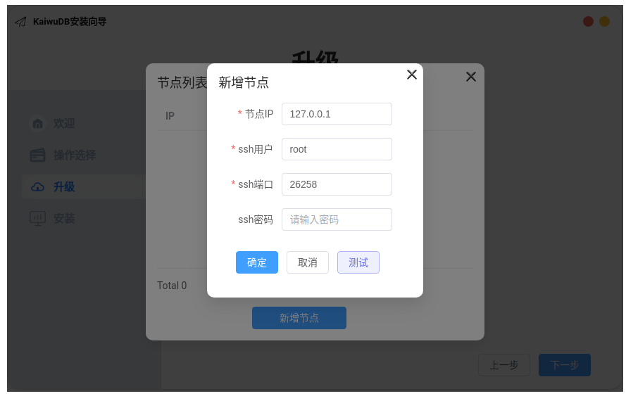- 在新增节点窗口,输入节点 IP 地址,用户名和节点端口,未设置免密登录需填写用户密码,点击测试,验证是否可以登录其他节点。然后点击确定。