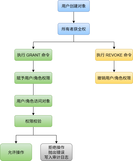 自主访问控制是一种由对象所有者自主决定权限分配的安全模型。对象(如表、视图)的创建者默认成为其所有者,拥有对该对象权限的绝对控制权,可自由授予或撤销其他用户的访问权限。授予或撤销其他用户的权限的用户具备目标对象的 GRANT