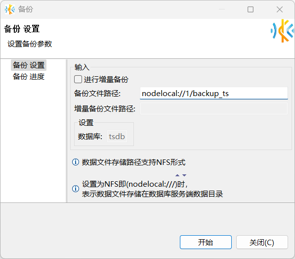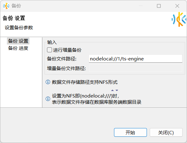 在备份窗口,根据提示设置备份文件路径,然后单击开始。设置完成后即可在备份进度页查看备份进度。