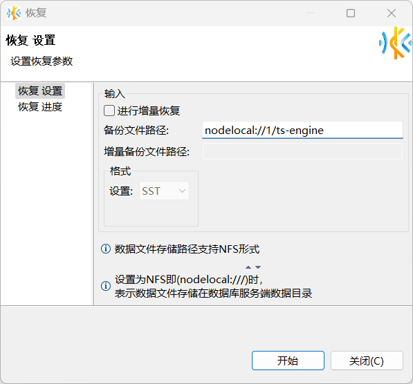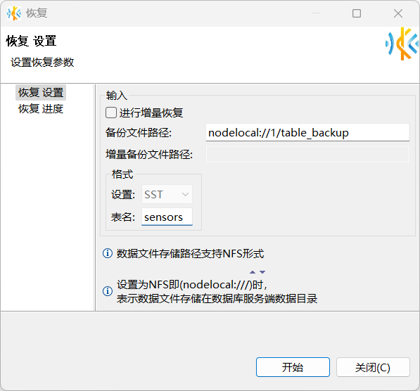 在恢复窗口,根据提示设置备份文件路径和目标表名,然后单击开始。设置完成后即可在恢复进度页查看恢复进度。