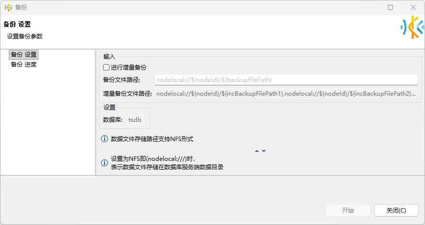 在备份窗口,根据提示设置备份文件路径,然后单击开始。设置完成后即可在备份进度页查看备份进度。