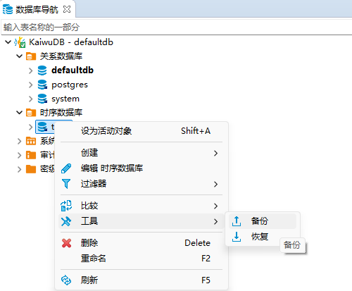 KaiwuDB 开发者中心支持创建、编辑、查看、切换、重命名、删除、备份和恢复时序数据库,对指定数据库进行权限管理。