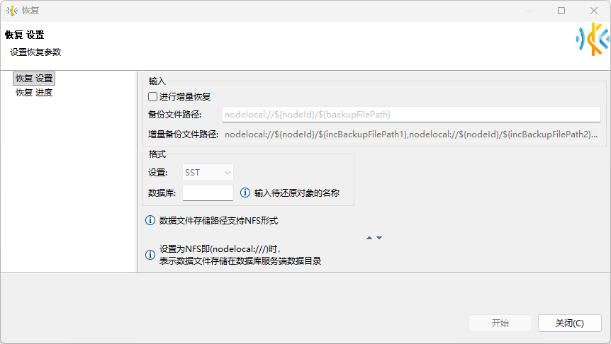 在恢复窗口,根据提示设置备份文件路径和数据库,然后单击开始。设置完成后即可在恢复进度页查看恢复进度。