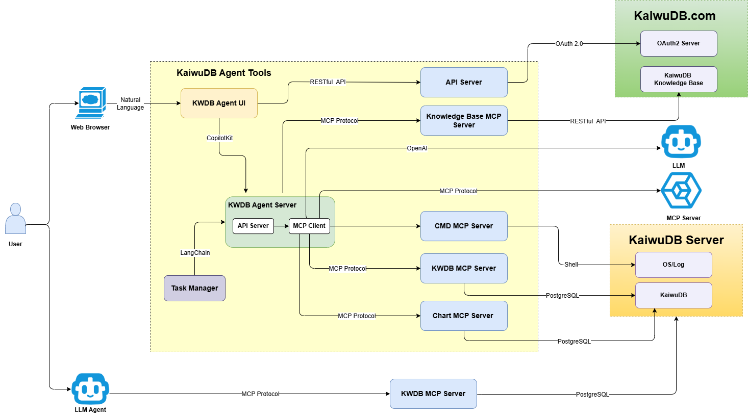 - KWDB Agent Server 以 RESTful API 的形式提供完整的 Agent 功能,将用户的自然语言请求转化为对 KaiwuDB 数据库的操作,使 LLM 模型能够通过 KWDB MCP Server 与 KaiwuDB 数据库交互。