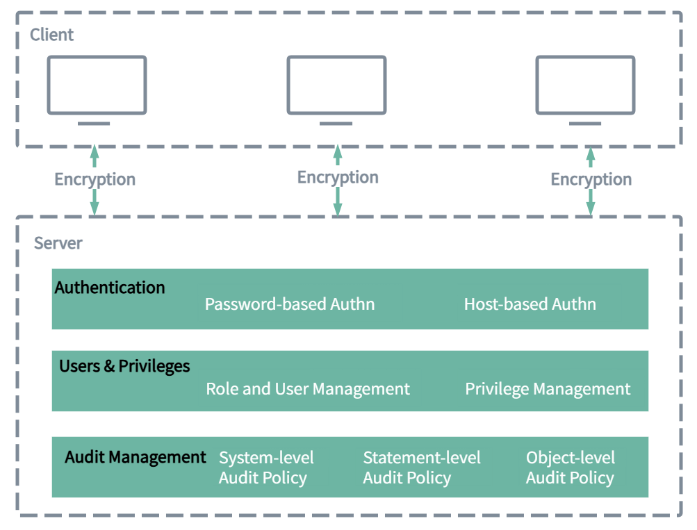 - Transport Encryption: KWDB supports encryption of data transmitted between the client and the server using the SSL/TLS protocol. This ensures that the data is not stolen or tampered during transport, improving transport security.