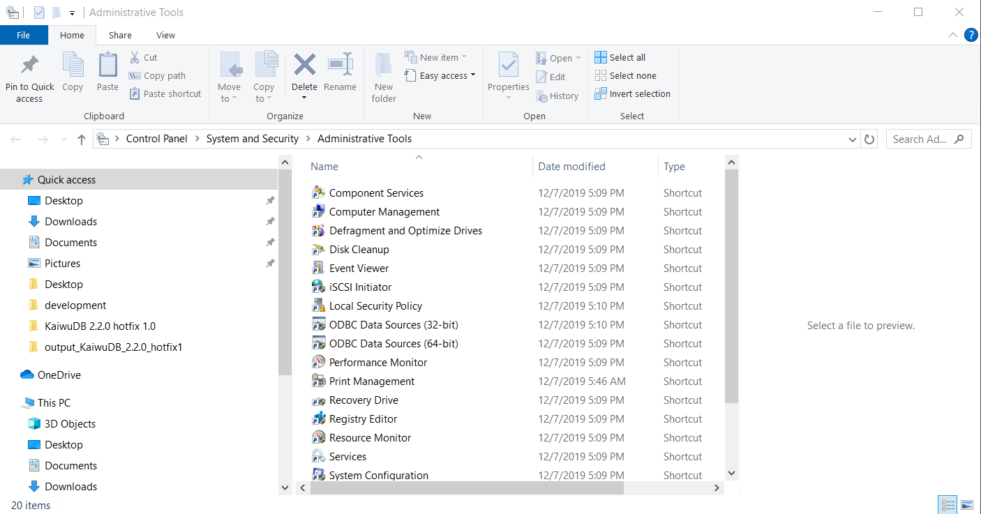 Navigate to Start > Control Panel > System and Security > Administrative Tools to open the Administrative Tools window.