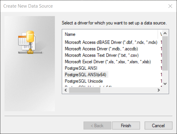 In the Create New Data Source dialog, select PostgreSQL ANSI(x64) and click Finish.