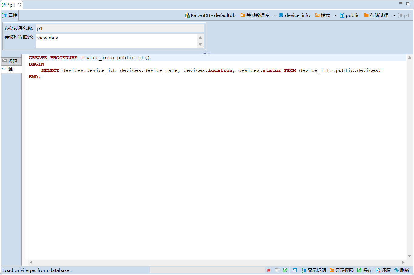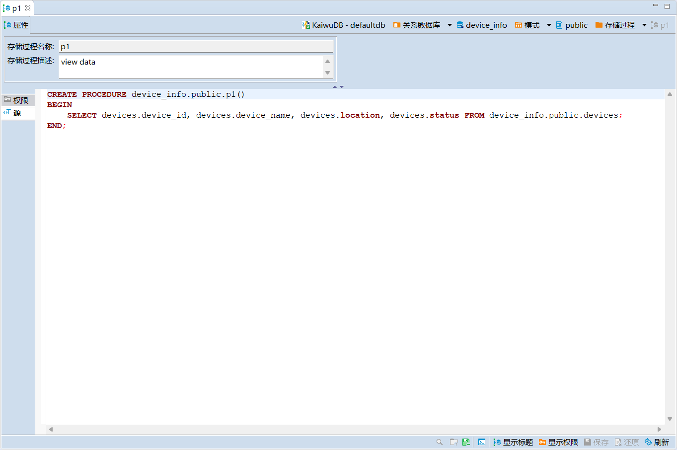 在数据库导航区,双击需要查看的存储过程,即可在该存储过程的详情页查看该存储过程的名称、描述、权限和 DDL 语句信息。