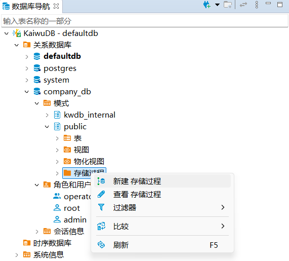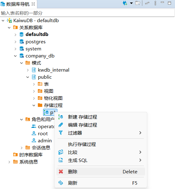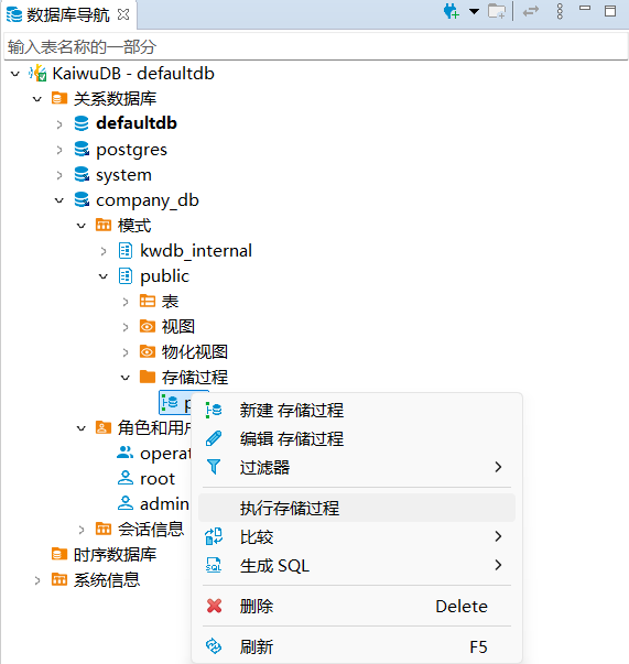 KaiwuDB 开发者中心支持存储过程的创建、调用、修改、查看和删除。