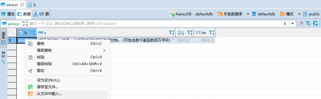 BYTEA类型:使用外部程序将二进制数据输入到数据库中,或者在数值查看器中手动输入数据。BLOB和CLOB类型:支持在数据编辑器页面通过从文件中载入导入数据,或通过保存至文件导出数据。为保证数据库性能,建议单个文件大小不超过 64MB。