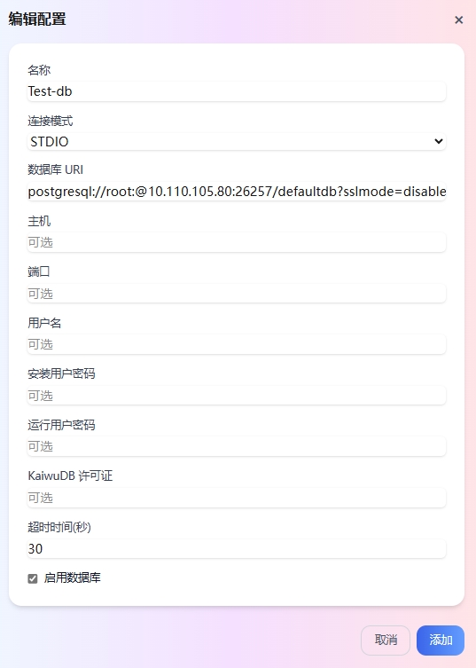 名称:数据库的配置名称,便于后续查询和管理数据库。连接模式:数据库连接模式。支持 STDIO 和 Streamable HTTP 模式。默认为 STDIO 模式。数据库 URI/数据库 URL:KWDB 数据库的连接地址。安装部署 KWDB 时该参数为必填参数。格式示例:postgresql://root:@<主机IP>:26257/defaultdb?sslmode=disable。主机:可选参数,KWDB 数据库所在主机的 IP 地址。端口:可选参数,KWDB 数据库所在主机的连接端口。用户名:可选参数,KWDB 数据库所在主机的安装用户名。安装部署 KWDB 时该用户必须为 root 用户。安装用户密码:可选参数,KWDB 数据库所在主机的安装用户密码。运行用户密码:可选参数,KWDB 数据库所在主机的运行用户密码。KaiwuDB 许可证:可选参数,KWDB 数据库无需配置。超时时间:设置数据库连接的超时时间(单位:秒)。默认为30s。启用数据库:配置是否启用数据库。勾选后,系统启用该数据库。通过 KAT 部署或连接 KWDB 时,需确保该选项已启用。