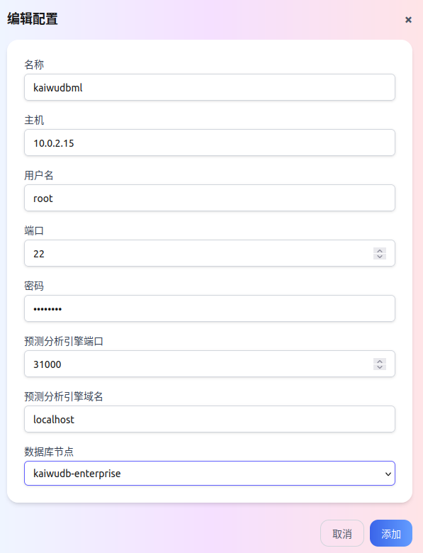 单击添加配置。然后在弹出的对话框中,添加 KaiwuDB 预测分析引擎信息。