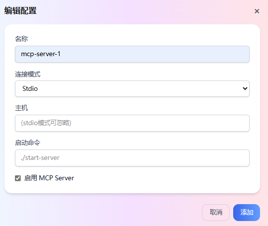 单击添加配置。然后在弹出的对话框中,添加 MCP Server 信息。
