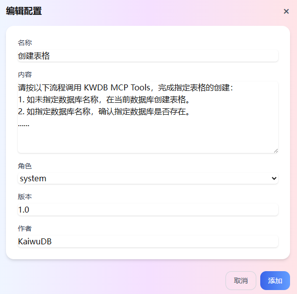 单击添加配置。然后在弹出的对话框中,自定义提示词。