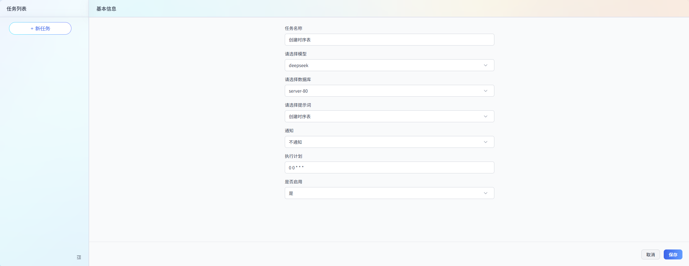 任务名称:任务的名称。便于后续查询和管理任务。模型:在下拉列表中选择目标 LLM 模型。数据库:在下拉列表中选择目标数据库。提示词:在下拉列表中选择目标提示词。说明