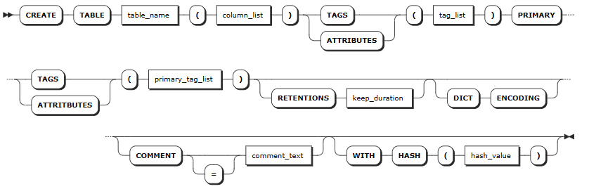 [RETENTIONS <keep_duration>] [DICT ENCODING] [COMMENT [=] <'comment_text'>] [WITH HASH(<hash_value>)]的顺序,否则系统将会报错。 - 3.0.0 版本中,表活跃时间和分区间隔的配置不会生效。