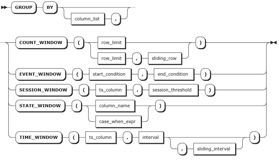 GROUP BY | GROUP BY 子句根据表达式或分组窗口函数将数据集划分成小组,然后对这些小组进行数据处理。聚合查询与 GROUP BY 连用时,应避免 GROUP BY 后的结果集行数过大。关于分组窗口函数的详细信息,参见分组窗口查询。 |