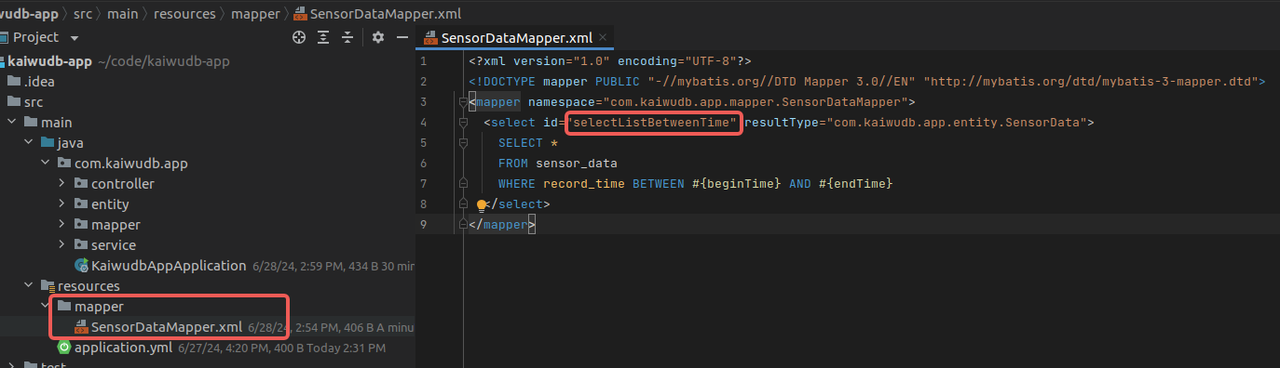 select标签中的id为selectListBetweenTime的 SQL 语法,对应 mapper 文件中的selectListBetweenTime接口。<?xml version="1.0" encoding="UTF-8"?> <!DOCTYPE mapper PUBLIC "-//mybatis.org//DTD Mapper 3.0//EN" "http://mybatis.org/dtd/mybatis-3-mapper.dtd"> <mapper namespace="com.kaiwudb.app.mapper.SensorDataMapper"> <select id="selectListBetweenTime" resultType="com.kaiwudb.app.entity.SensorData"> SELECT * FROM sensor_data WHERE record_time BETWEEN #{beginTime} AND #{endTime} </select> </mapper>结果如下: