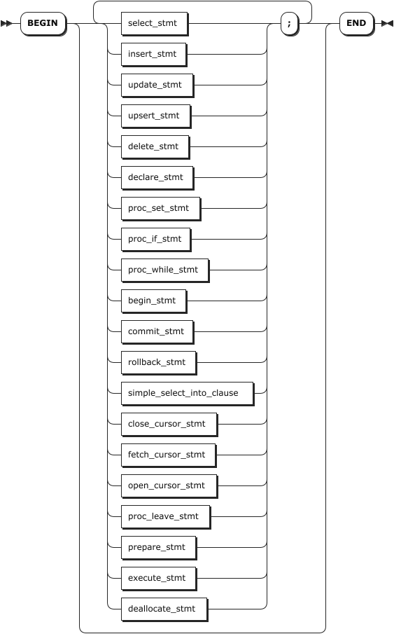 DECLARESETSELECT、DELETE、INSERT、UPDATE INTO、UPSERTOPEN、FETCH、CLOSECONTINUE HANDLER、EXIT HANDLERIFELSELOOPLABELLEAVE- 事务语句